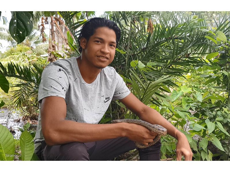 Waarom ik deze slang om mijn arm heb? Toen ik als kind hier kwam wonen had bijna iedere bewoner een dier thuis. Papegaaien, slangen, apen, spinnen en zelfs arends. Zo begon ik ook dieren te observeren en raakte ik geïnspireerd om zelf dieren te kweken. De eerste keer dat ik een slang vastpakte was ik 6.