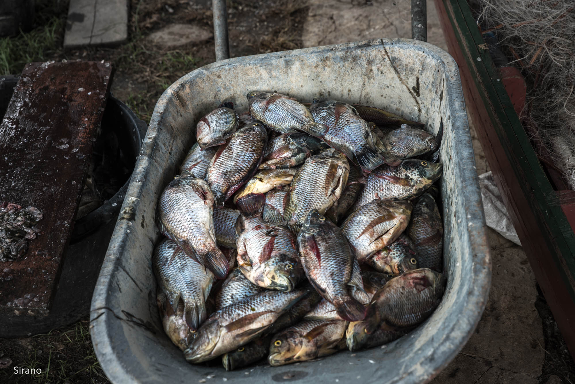 Als er veel tilapia’s zijn gevangen worden die apart gezet om gezouten vis van te maken. De tilapia’s worden eerst opengesneden. De ingewanden verwijderd en de vis verder schoongewassen. Vervolgens zet ik ze in emmers met zoutwater om ze goed te laten intrekken. Na een dag of twee haal ik ze eruit en zet ze vervolgens op een zinken dak of tafel om in de zon verder te drogen.
